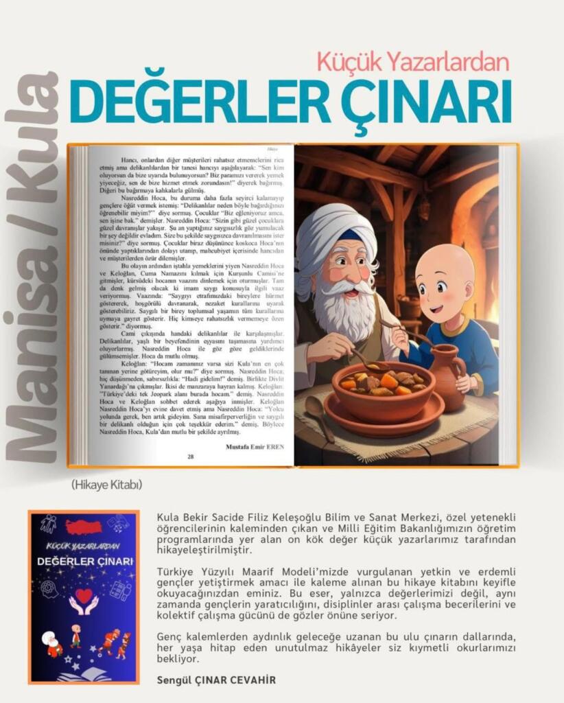 Kula Bekir Sacide Filiz Keleşoğlu Bilim ve Sanat Merkezi, Genel Yetenek Alanı BYF-1 programına devam eden 13 özel yetenekli küçük yazarımızın ortaya çıkardığı bu eser, Milli Eğitim Bakanlığımızın öğretim programlarında yer alan on kök değerle ilgili özgün hikâyelerden oluşmaktadır.