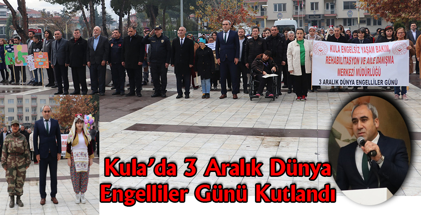 Kula Engelsiz Yaşam, Bakım, Rehabilitasyon Merkezi Müdürlüğü tarafından düzenlenen 3 Aralık Dünya Engelliler günü töreni ve farkındalık yürüyüşü” programı Yunus Emre ve Şehit Ömer Halisdemir Kent Meydanı’nda Atatürk Anıtı’nda Saygı duruşu ve İstiklal Marşı ile başladı. Çelenk sunma töreni ardından yaren ekibi ile birlikte katılımcılar Atatürk Anıtı önünden başlayarak Kula Belediyesi önünde son bulan farkındalık kortej yürüyüşü gerçekleştirdi.
