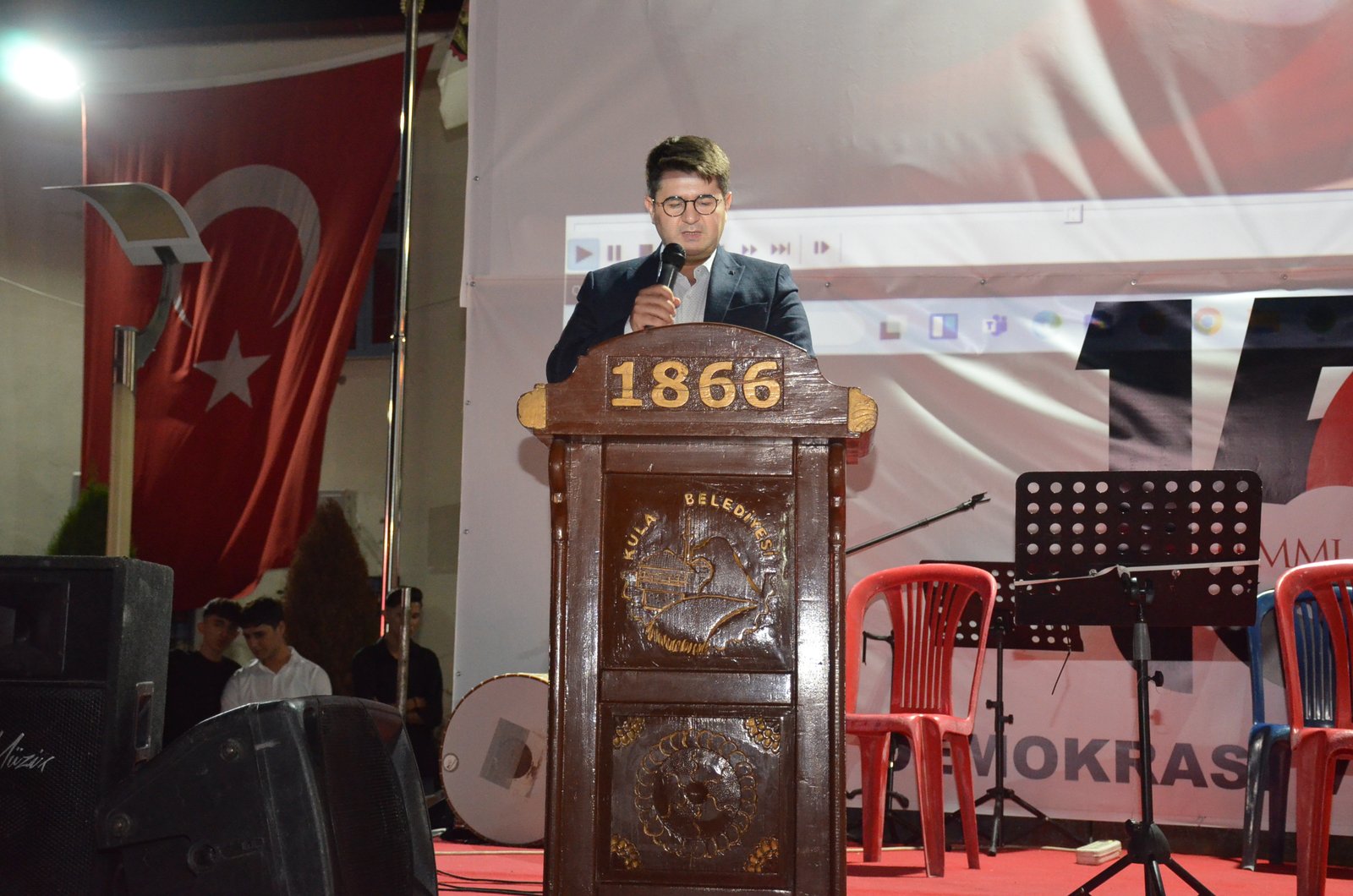 15 Temmuz Pazartesi günü yapılan programda Akşam namazı Süleyman Şah camiinde kılınarak namaz sonrasında Mehteran ekibi ile yürüyüş yapılarak Kula Kent meydanına gelindi. Kula Kent meydanındaki program Saygı duruşu ve İstiklal Marşı ile başladı. Şehitlerimiz anısına Kur’an tilaveti ve dualar okundu. Yaren ekibinin gösterilerinin ardından Gaziler Derneği adına Gazi İsmail Kara konuşmasını yaptı. Belgeseller ve video gösterimleri izleyicileri duygu dolu anlar yaşattı. Kula Kaymakamı Ömer Ahmet Özdemir’in konuşmasının ardından Selim Sabahat Palanduz Anadolu Lisesi öğrencilerinin hazırlamış olduğu müzik dinletisi ve Mahalli Sanatçı Sami Dinç ve Kula’da Değerli Zamanlar Müzik ekibi dinletilerini yaptılar. İlahi ve kasidelerin ardından saatler 00:13 gösterdiğinde tüm camilerden ilahiler okundu ve kula kent meydanındaki program son buldu.