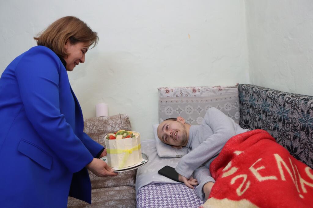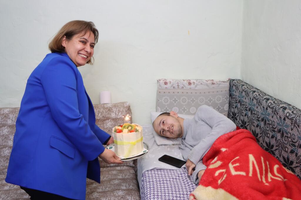 Başkan Vekili Semra Gündüz, 3 Aralık Dünya Engelliler Günü’nde Dereköy Mahallesi’nde yaşayan özel gereksinimli Adnan Kaptan’ı ziyaret etti. 10 Aralık’ta doğum günü olan Adnan’a erken sürpriz yaparak pasta hediye eden Gündüz, Kaptan ailesini mutlu etti. Adnan Kaptan ve ailesi, Gündüz’ün bu jestiyle büyük bir moral bulduklarını ifade ederken, Başkan Vekili Semra Gündüz, engelli bireylerin yaşamlarını kolaylaştırmak için daha çok çalışacaklarını belirtti.