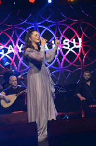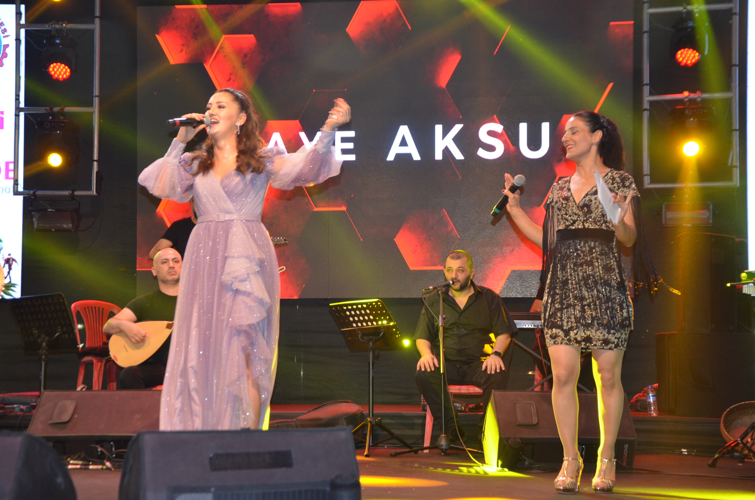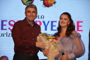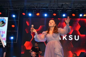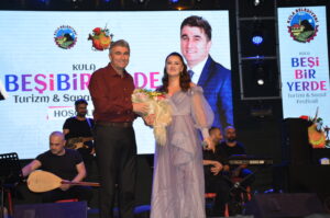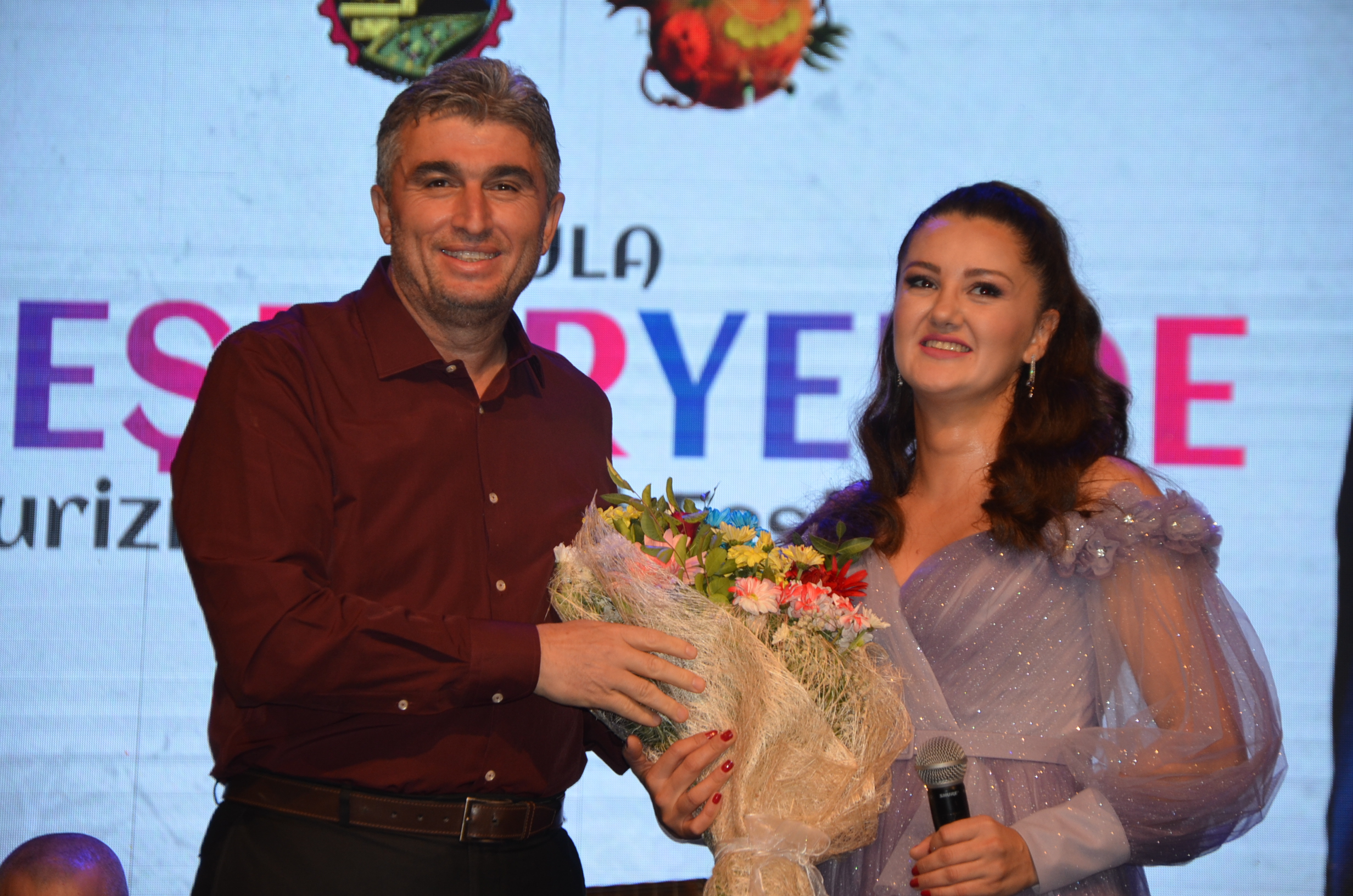 Konser’de Belediye Başkanı Hüseyin Tosun, festival hatırası olarak Gaye Aksu’ya  çiçek ve maket Kula Evi hediye etti.