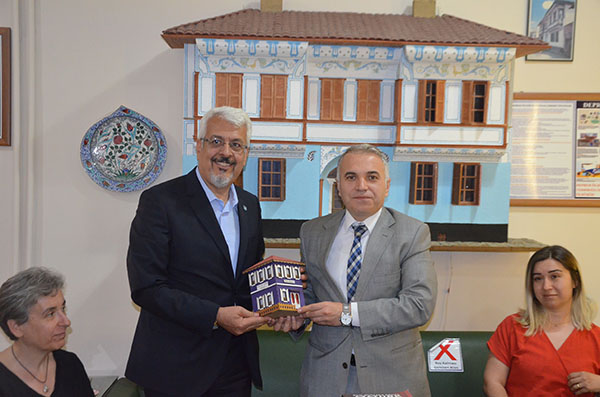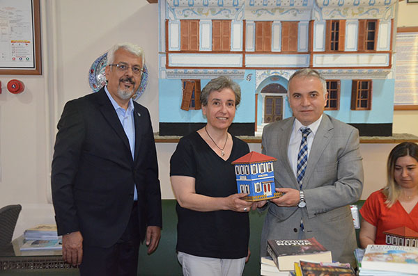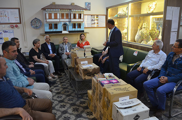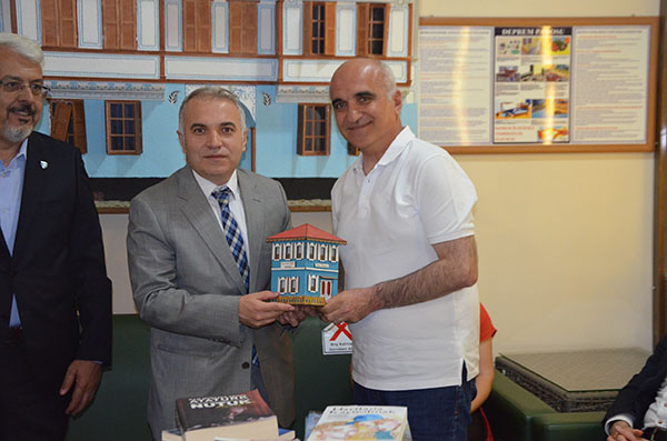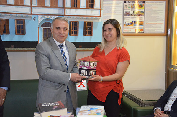 Kula Halk Eğitim merkezindeki programına katılan Kula Kaymakamı Kemal Duru kitap bağışında bulunan okul idarecilerine maket Kula Evi hediye etti.