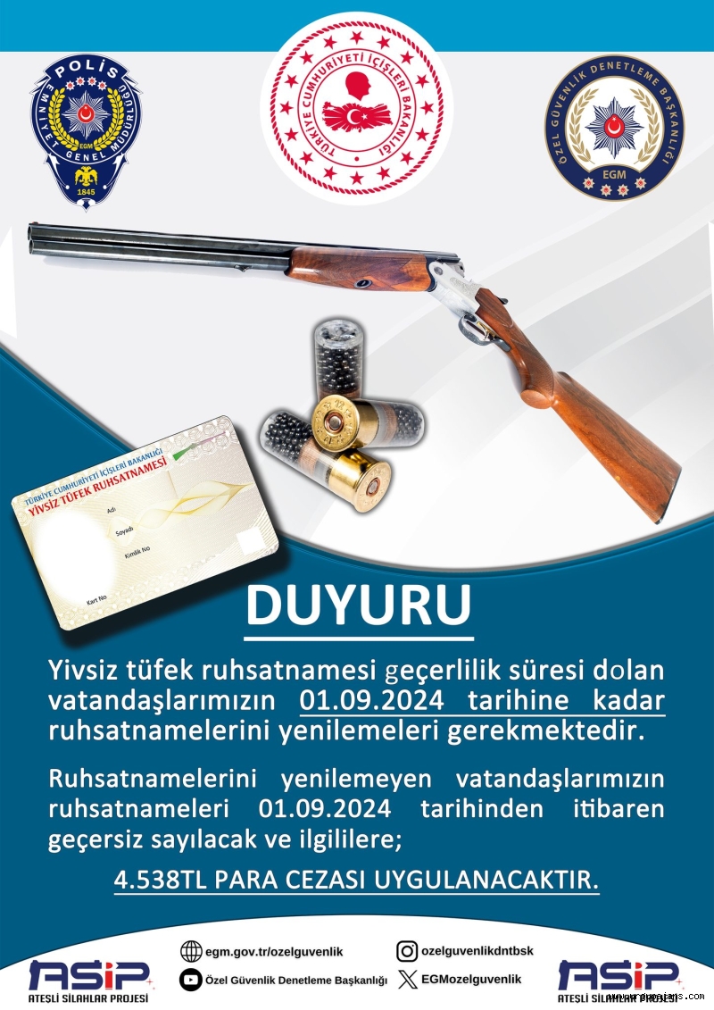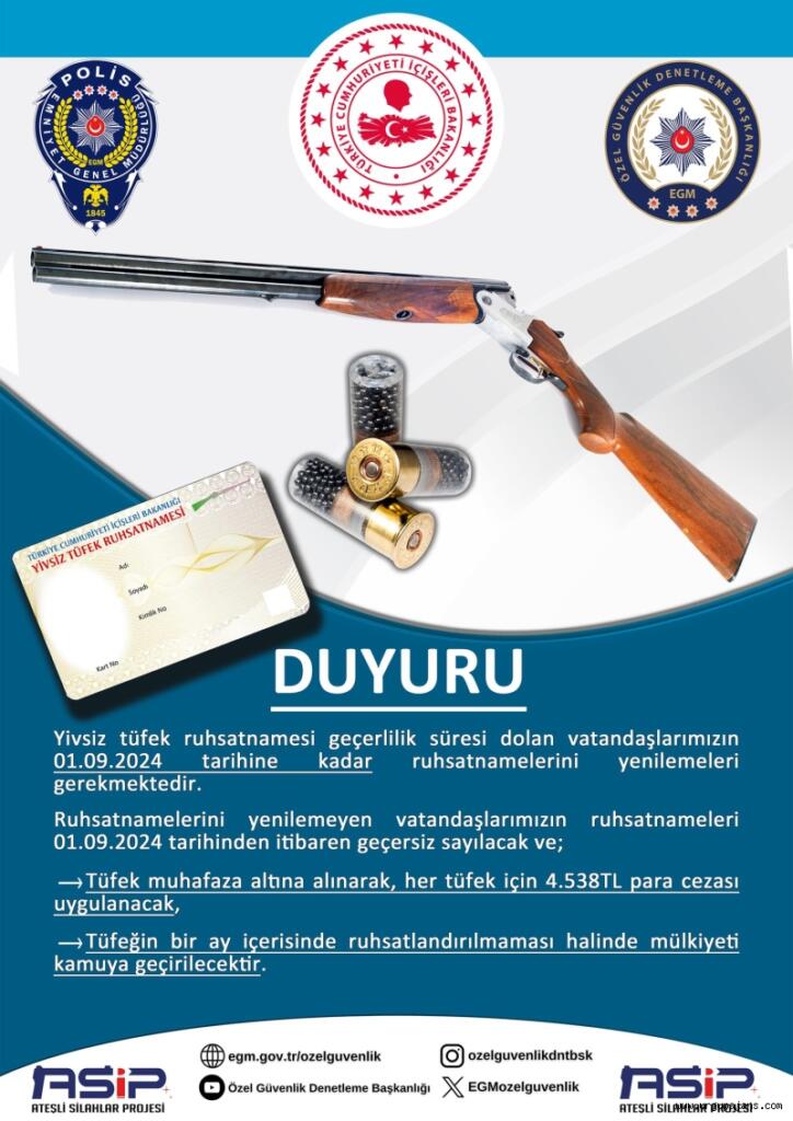 Kula İlçe Emniyet Müdürlüğünden yivsiz tüfek ruhsat yenileme uyarısı