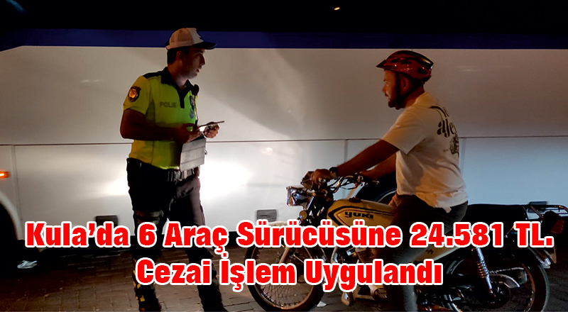 Kula ilçe genelinde uygulanan denetimde 3 ekip ve 9 personel görev aldı. 39 aracın kontrol edilmesi sonucunda 6 araç sürücüsüne toplamda 24.581 TL. cezai işler uygulandı. 1 araç ise trafikten men edildi.