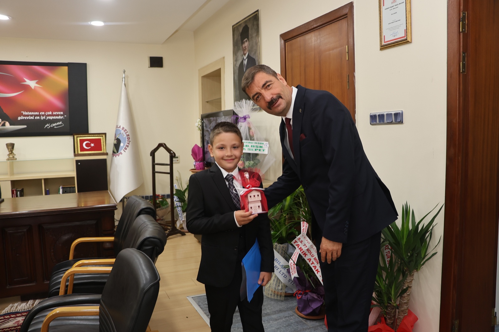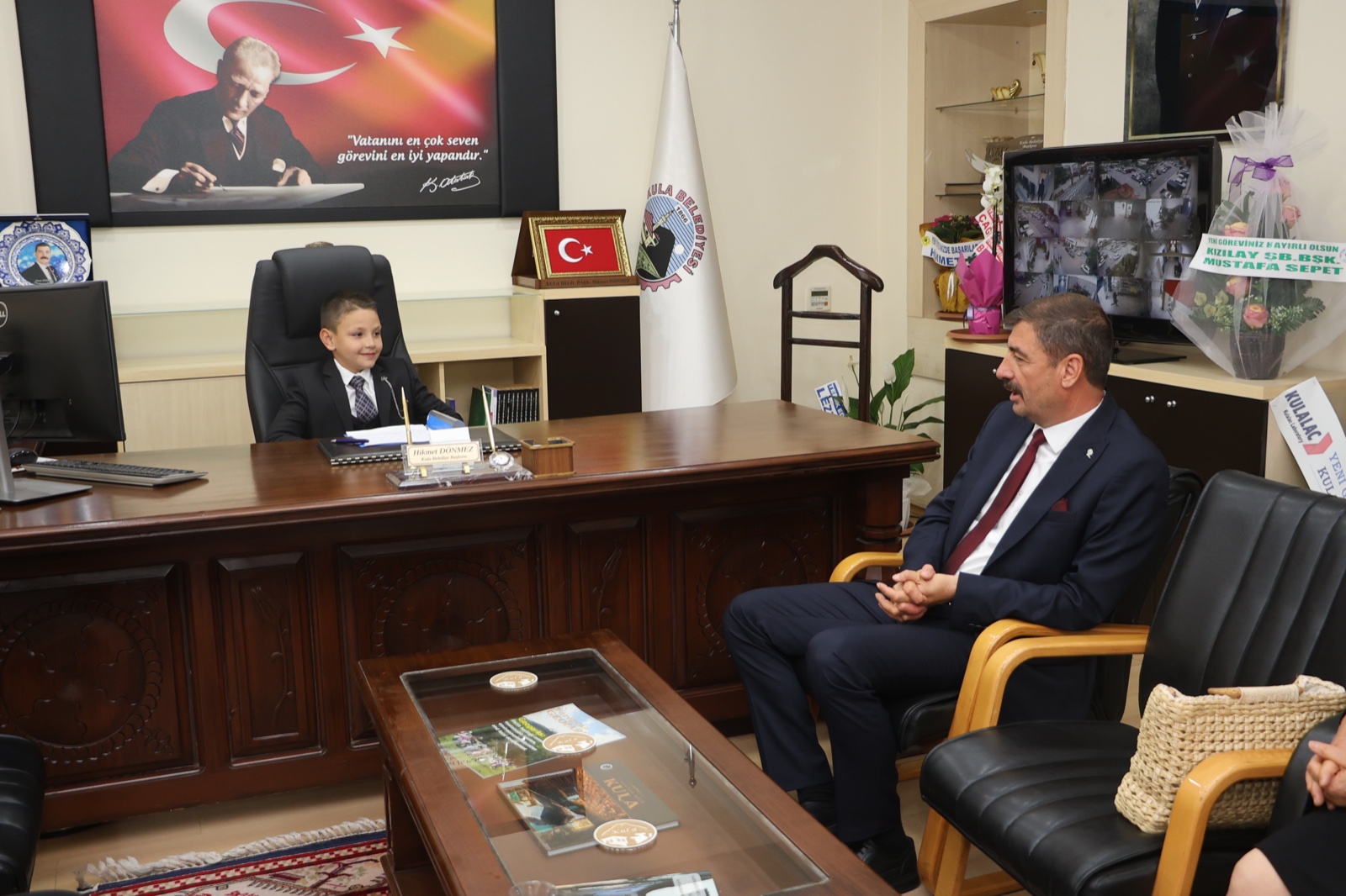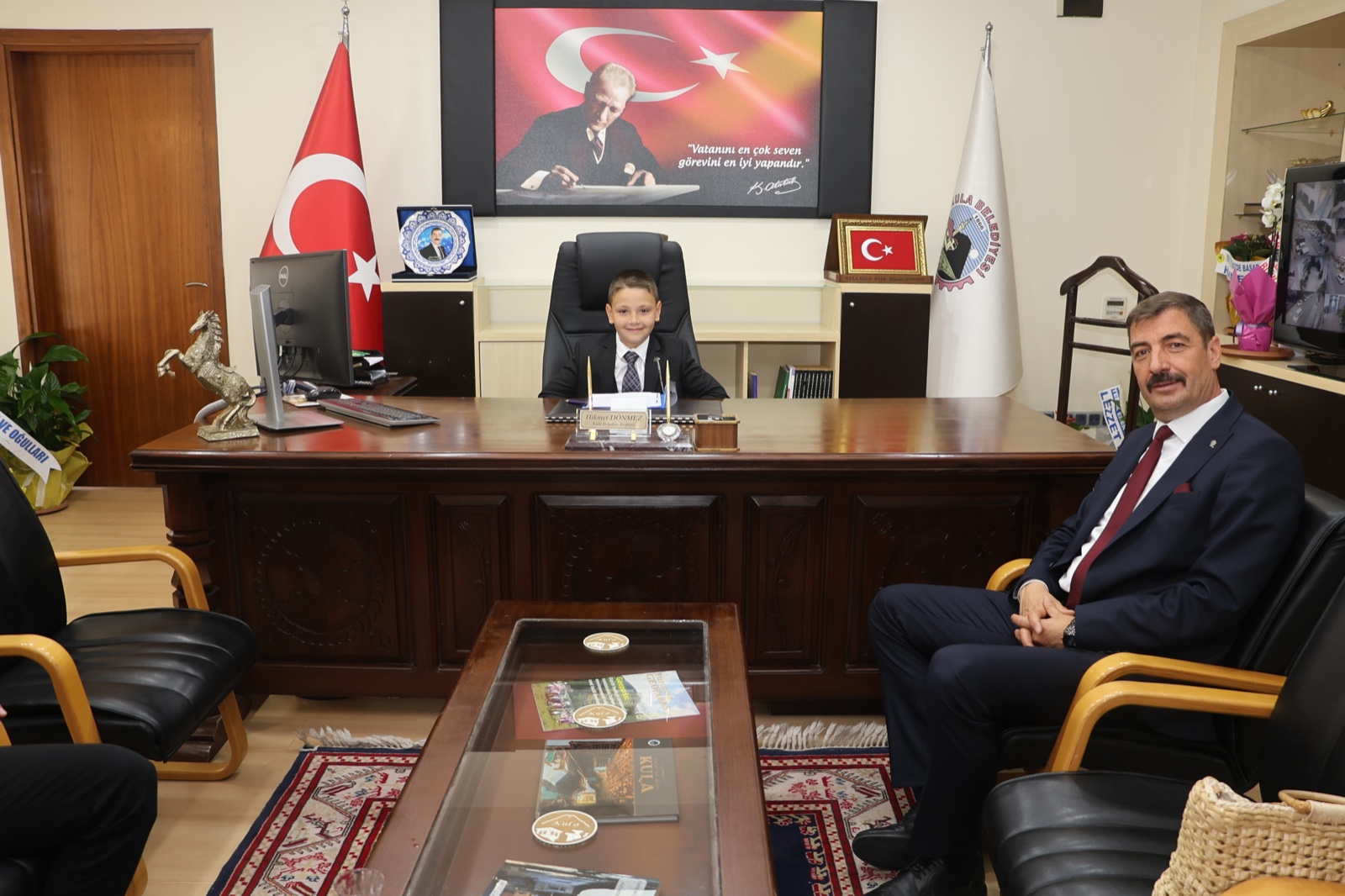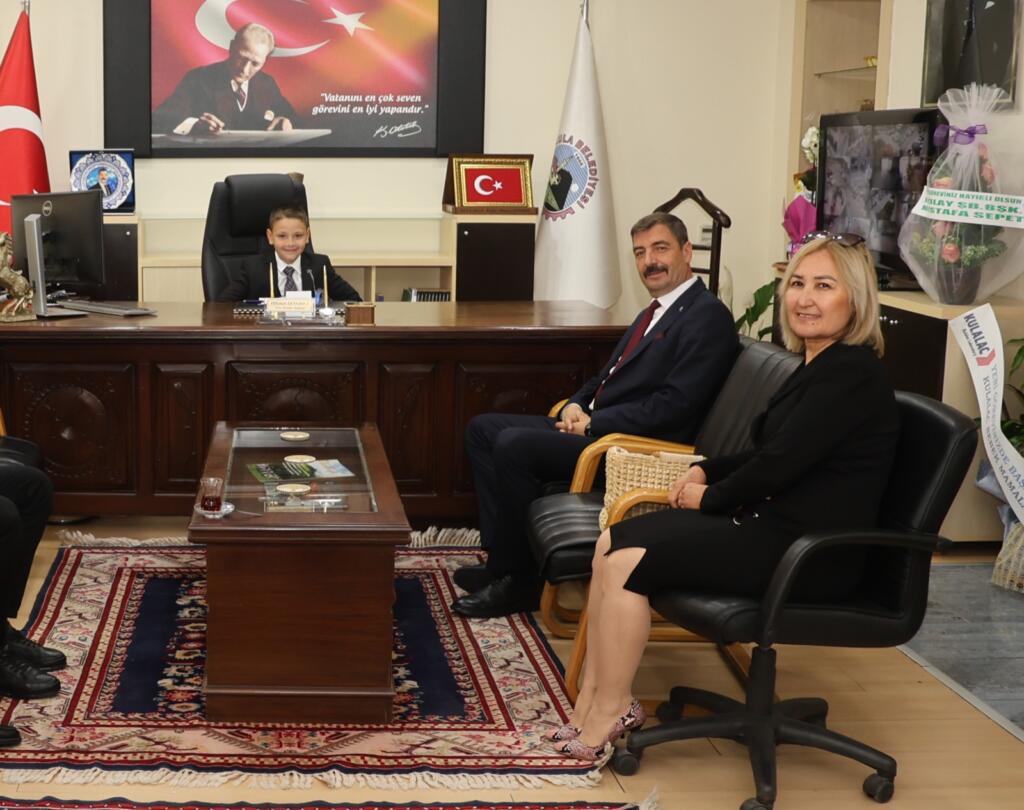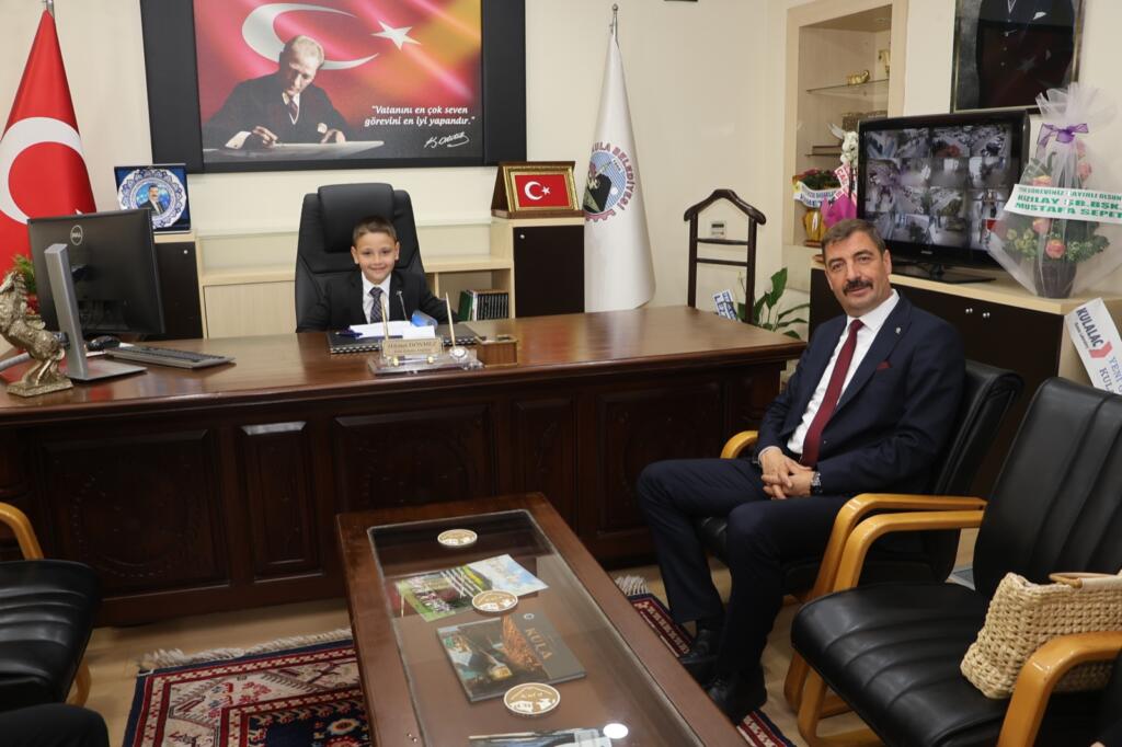 Kula Belediye Başkanı Mehmet Hikmet Dönmez, bir süreliğine çocukları temsilen Kula Belediye Başkanı makamına oturan Ege Kaan Erkaya ve öğretmeni Naciye Akçin, Kula Belediye Başkanı Hikmet Dönmez ile bir süre görüşerek sohbet etti.