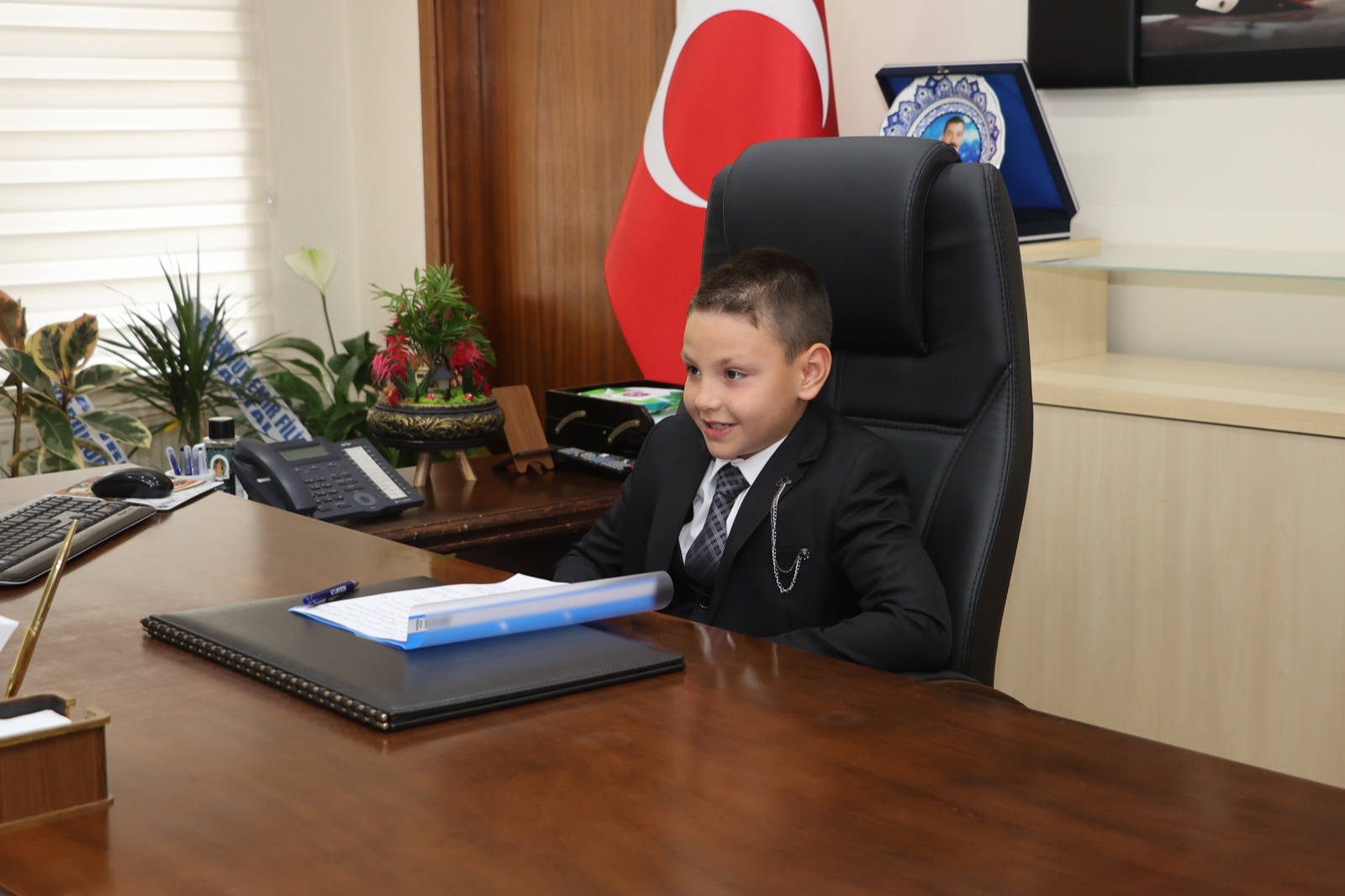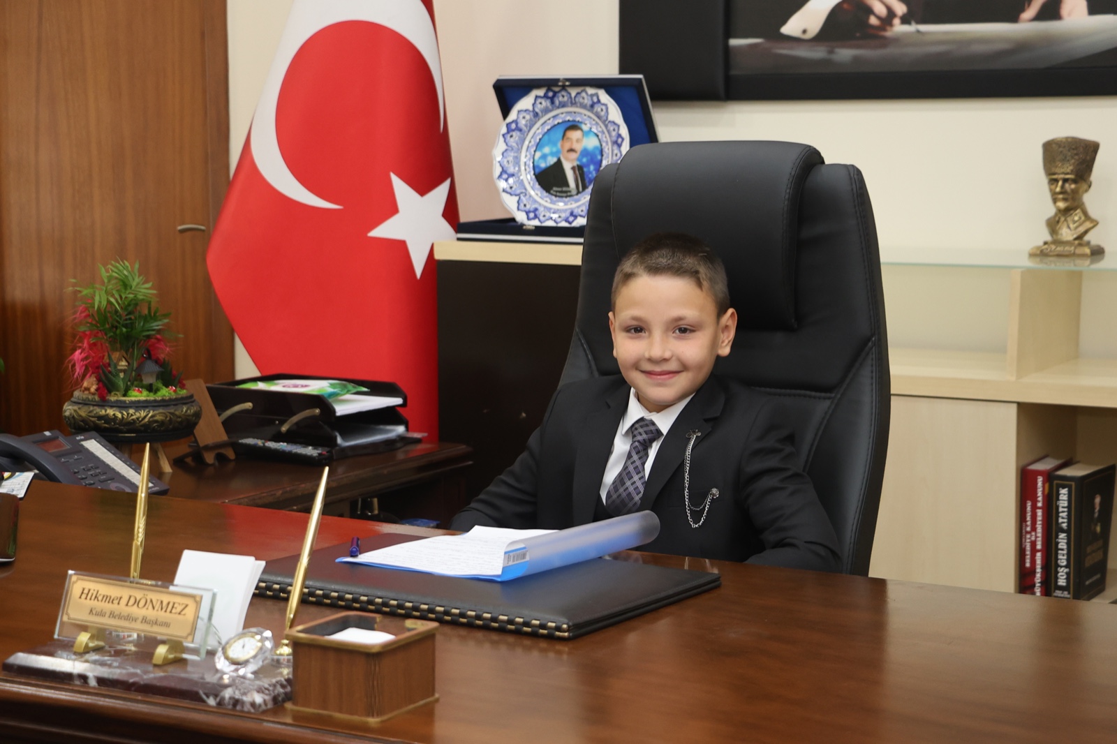Türkiye Cumhuriyeti’nin kurucusu Gazi Mustafa Kemal Atatürk tarafından dünya üzerinde çocuklara armağan edilen tek bayram olan 23 Nisan Ulusal Egemenlik ve Çocuk Bayramı dolayısıyla Kula ilçesinde Tabduk Emre İlkokulu 4. sınıf öğrencisi Ege Kaan Erkaya, Kula Belediye Başkanlığı koltuğuna oturdu.