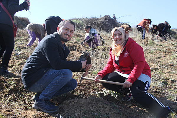Fidan dikim etkinliği bir yandan da renkli görüntülere sahne oldu. Rafet Üçelli Ortaokulu’nda Fen Bilimleri öğretmeni olarak görev yapan Selçuk Şentürk ile Gençlik ve Spor Bakanlığı’na bağlı Kula Gençlik Merkezi’nde Gençlik Lideri olarak görev yapan Sergül Şentürk çifti, aile fidanları diktiler. Hem fidan diken öğrencilere yardımcı olup öğrencilere doğaya faydalı olmaları konusunda nasihatler veren genç çift, hem de ellerine aldıkları fidanları toprakla buluşturup can suyu verdiler.