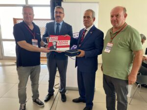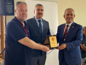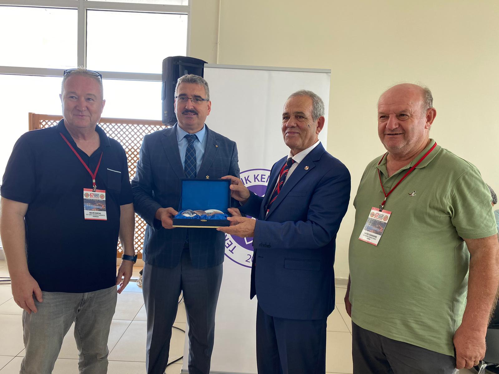 Rektör Mümin Şahin, TGF Genel Başkanı Yılmaz Karaca’ya hediye takdim ederken, Genel Başkan Karaca da Rektör Şahin’e plaket sundu.